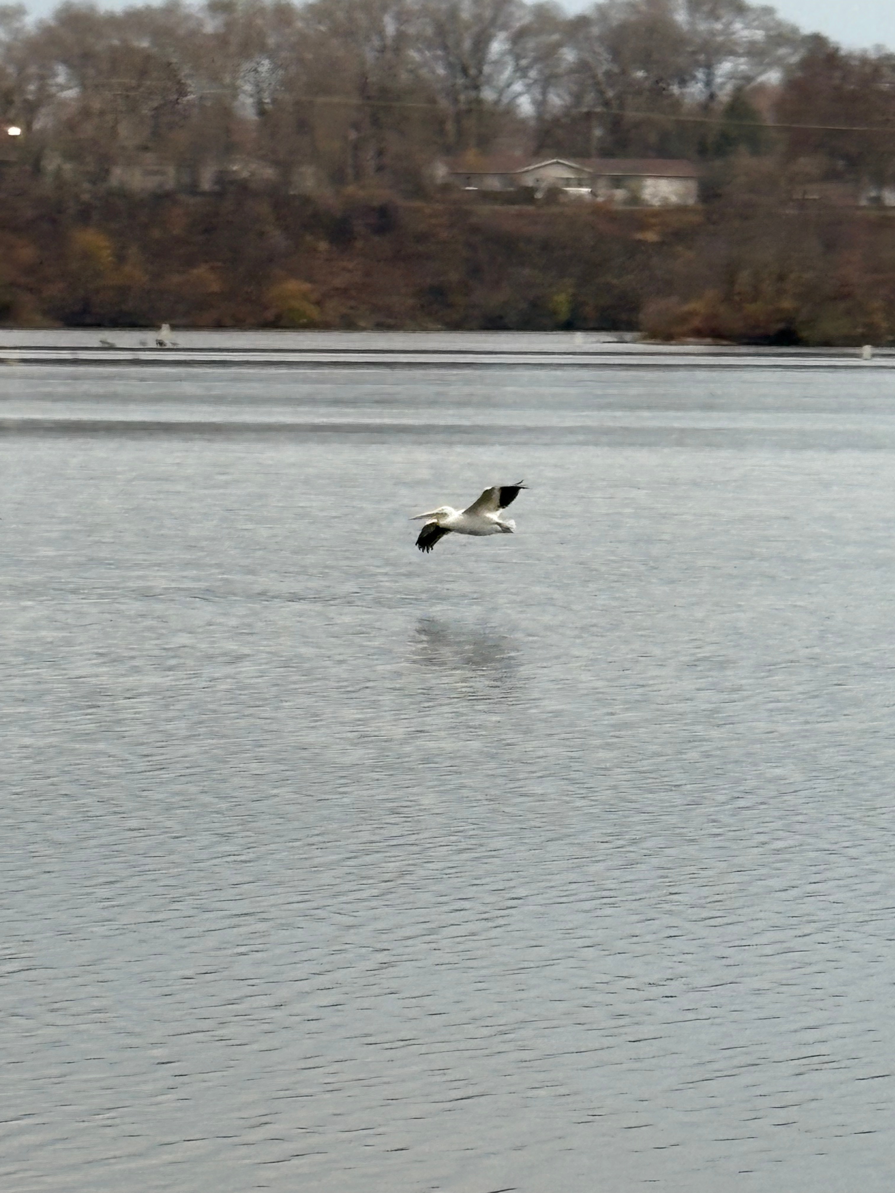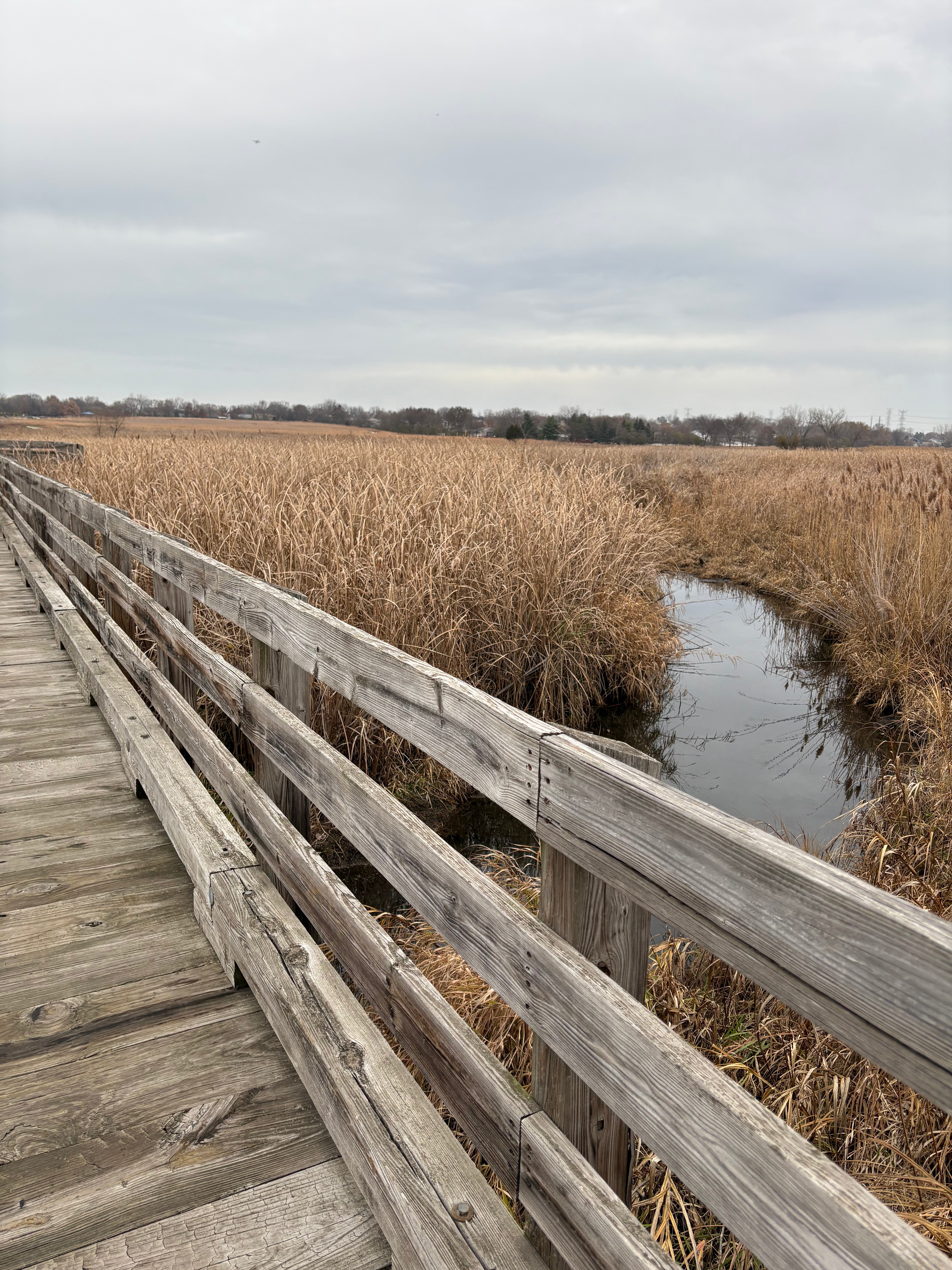 Cloud cover and cold mist set the stage for our next hike through Rock Run Rookery though it offered a bit more in the way of scenery with a large lake and what we think might be American White Pelicans. (I’m not a “birder” and it took a bit of internet searching to estimate the species.) Whatever they were, they were plentiful and graceful, swimming in small groups or hanging out on the water. The path itself is just under a mile long, beginning with a paved surface then transitioning to a really cool boardwalk-type pathway out into the tall grasses and over the waterway. On a warm sunny day I think this would be a picturesque spot to eat at one of the picnic tables, drop a canoe or kayak, or birdwatch, though I read that winter is a great time to see bald eagles. I’d like to go back someday and explore a bit more.