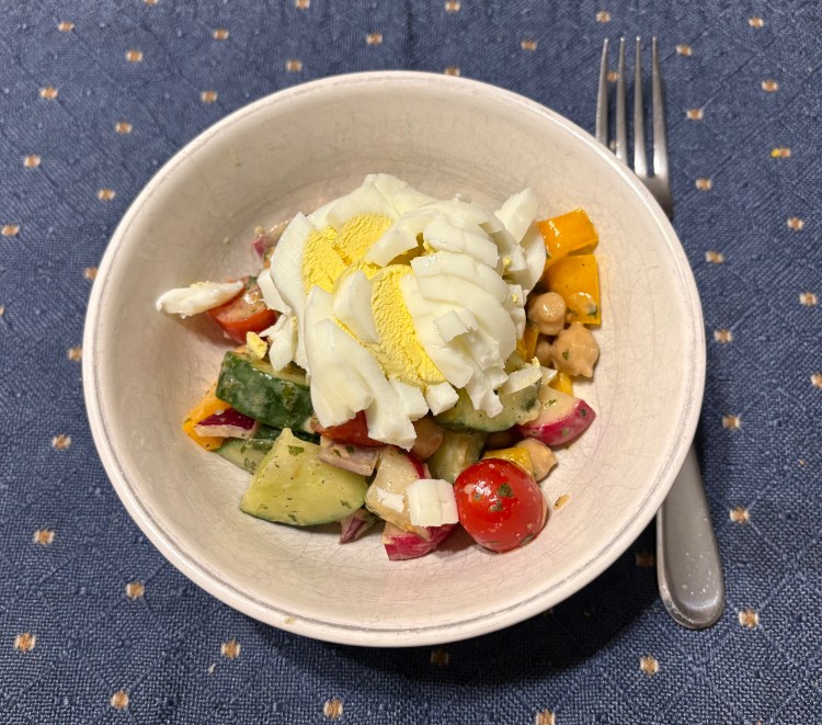 Delicious. Nutritious. Colorful. Flavorful. All in one bowl. This recipe is super easy to make and really packs a punch. It’s got cucumbers, tomatoes, bell pepper, chickpeas, onion lightly bathing in a subtle, but tasty dressing. With a hard-boiled egg on top, it really is a full meal – and filling! This particular recipe comes from a pamphlet of sorts called ‘Mediterranean Diet Recipes’ and is one of a 3-part set by Hamiew that includes guidelines on what to eat, how much, and nutrition facts for lots of foods.